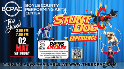 Get ready for an action-packed, family-friendly experience when The Perondi’s Stunt Dog Experience takes the stage at the Boyle County Performing Arts Center on Saturday, May 2nd with shows at 3:00 PM & 7:00 PM!